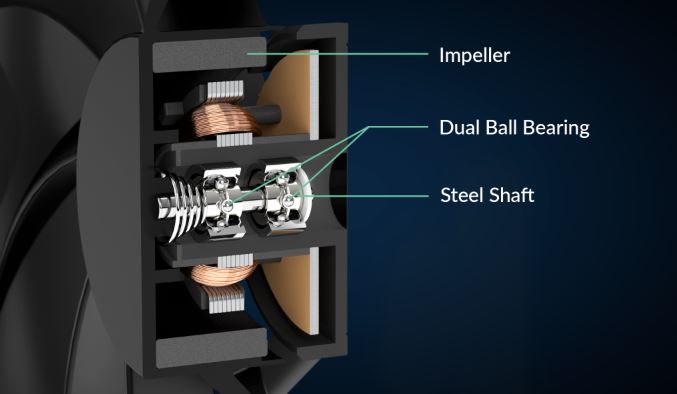Oba ventilátory Freezer 4U-SP5 jsou vybaveny duálními kuličkovými ložisky, což umožňuje nepřetržitý provoz 24/7 bez sebemenších kompromisů ve výkonu. Tento typ ložisek je mnohem odolnější vůči znečištění a opotřebení způsobenému vysokými teplotami než běžná kluzná ložiska nebo fluidně dynamická ložiska a je proto perfektní volbou, pokud chcete zajistit bezporuchový nepřetržitý provoz