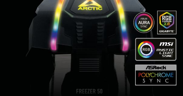 13 A-RGB LED diod instalovaných ve Freezeru 50 je autonomně ovladatelných. Freezer 50 je kompatibilní s běžnými standardy A-RGB předních výrobců základních desek pro co nejjednodušší použití. Lze jej tedy plně osvětlit přímo přes konektor A-RGB na základní desce nebo pomocí externího ovladače a synchronizovat s osvětlením ostatního hardwaru. Partner společnosti ARCTIC, SignalRGB, nabízí komplexní řešení pro synchronizaci a individuální konfiguraci osvětlení.