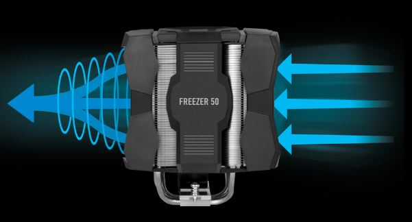 Freezer 50 je vybaven dvěma ventilátory typu P, které pracují v konfiguraci push-pull. Kombinace 120mm a 140mm ventilátoru vede ke zvýšení proudění vzduchu pro lepší chlazení, a zároveň k udržení nízké hladiny hluku a instalační výšky.