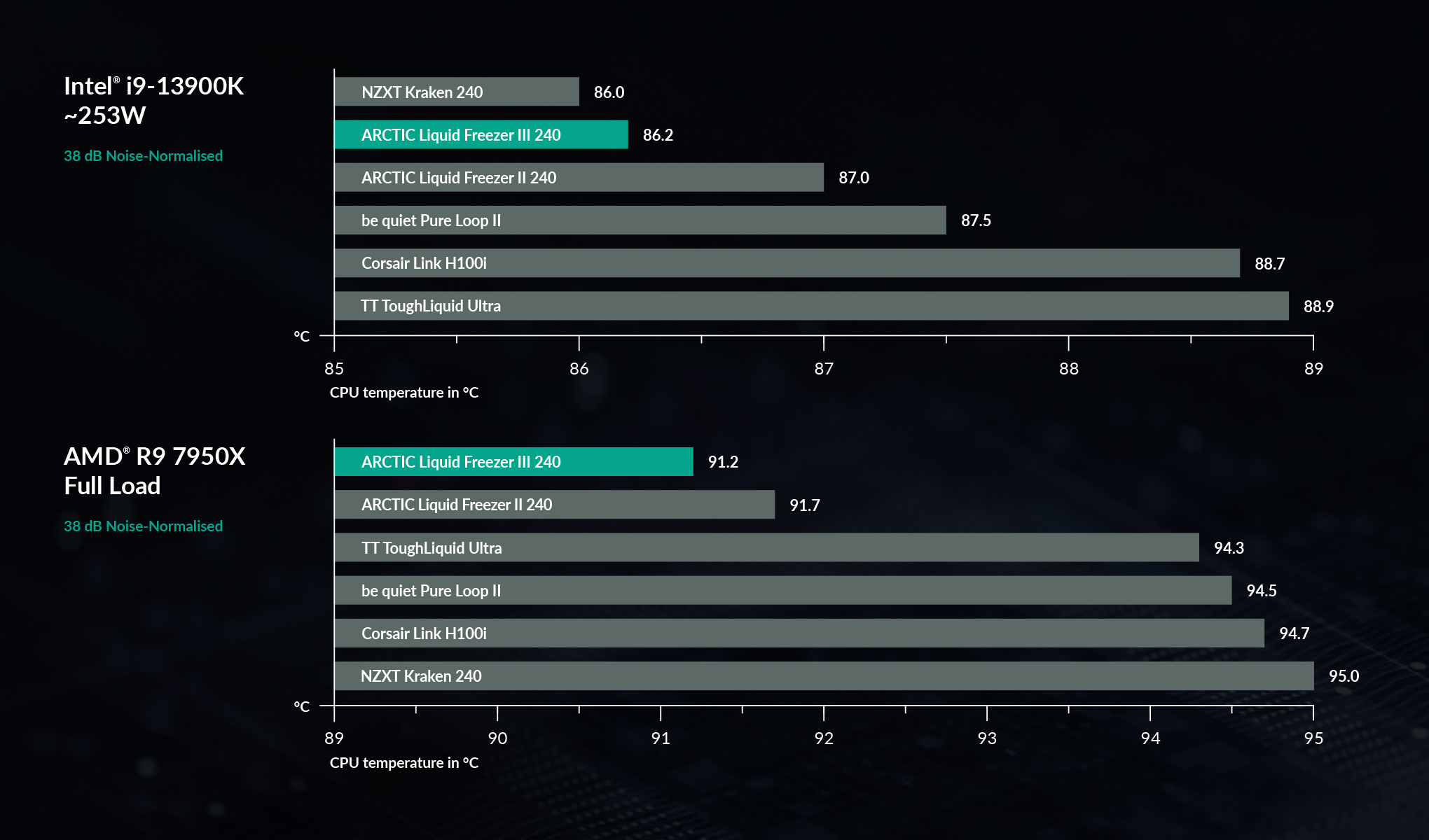 V nezávislĂ˝ch testech se Liquid Freezer III jasnÄ› odlišuje od konkurence ve všech cenovĂ˝ch kategoriĂch, zejmĂ©na dĂky svĂ©mu vynikajĂcĂmu vĂ˝konu. V testech normalizovanĂ©ho hluku ukazuje Liquid Freezer III svou skuteÄŤnou sĂlu a svĂ˝m tichĂ˝m a pĹ™itom vĂ˝konnĂ˝m provozem pĹ™ekonává mnoho konkurentĹŻ.