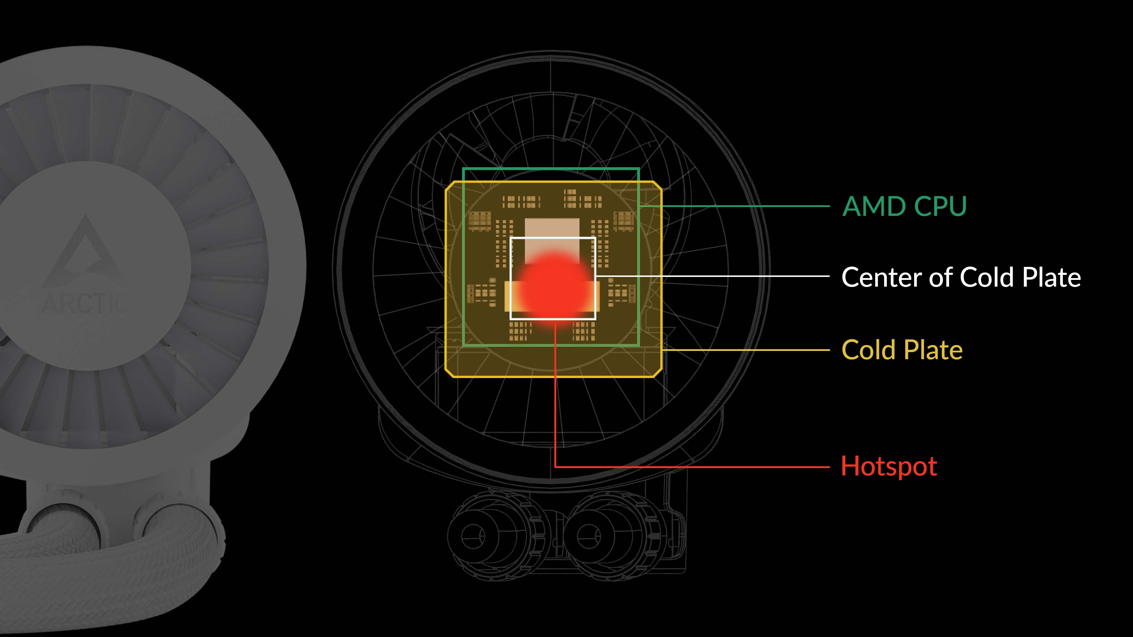 Již několik generací používá společnost AMD u svých desktopových procesorů Ryzen konstrukci s více čipy. Na rozdíl od procesorů Intel není hotspot u těchto procesorů umístěn centrálně pod IHS (Integrated Heat Spreader), ale je mírně odsazen. Montážní řešení AMD má proto 5 mm odsazení, aby bylo dosaženo optimálního odvodu tepla.