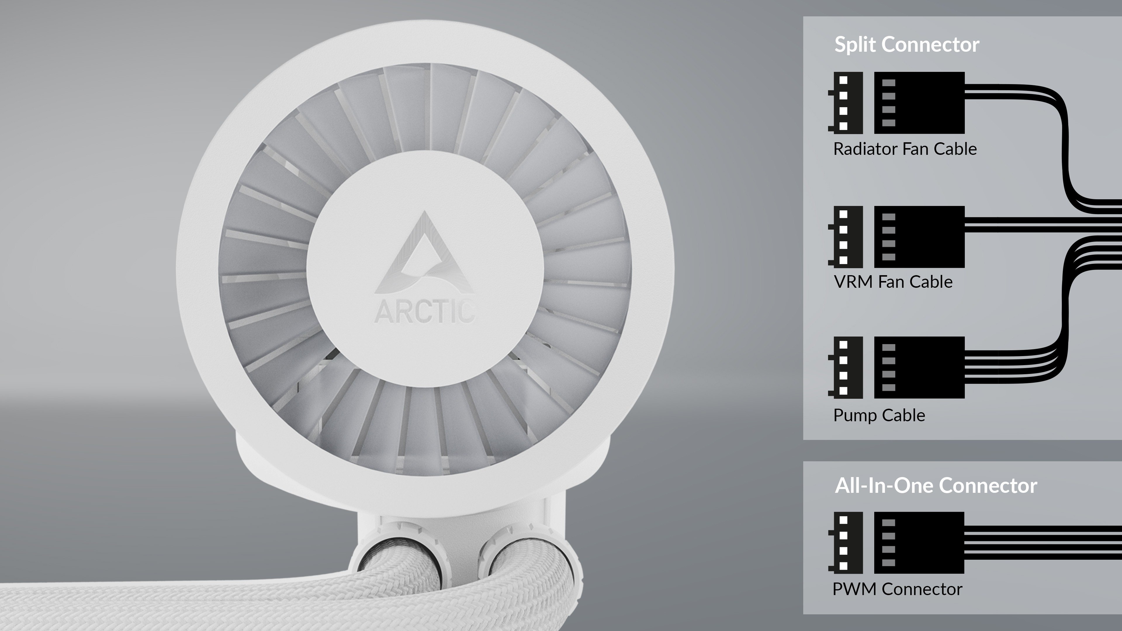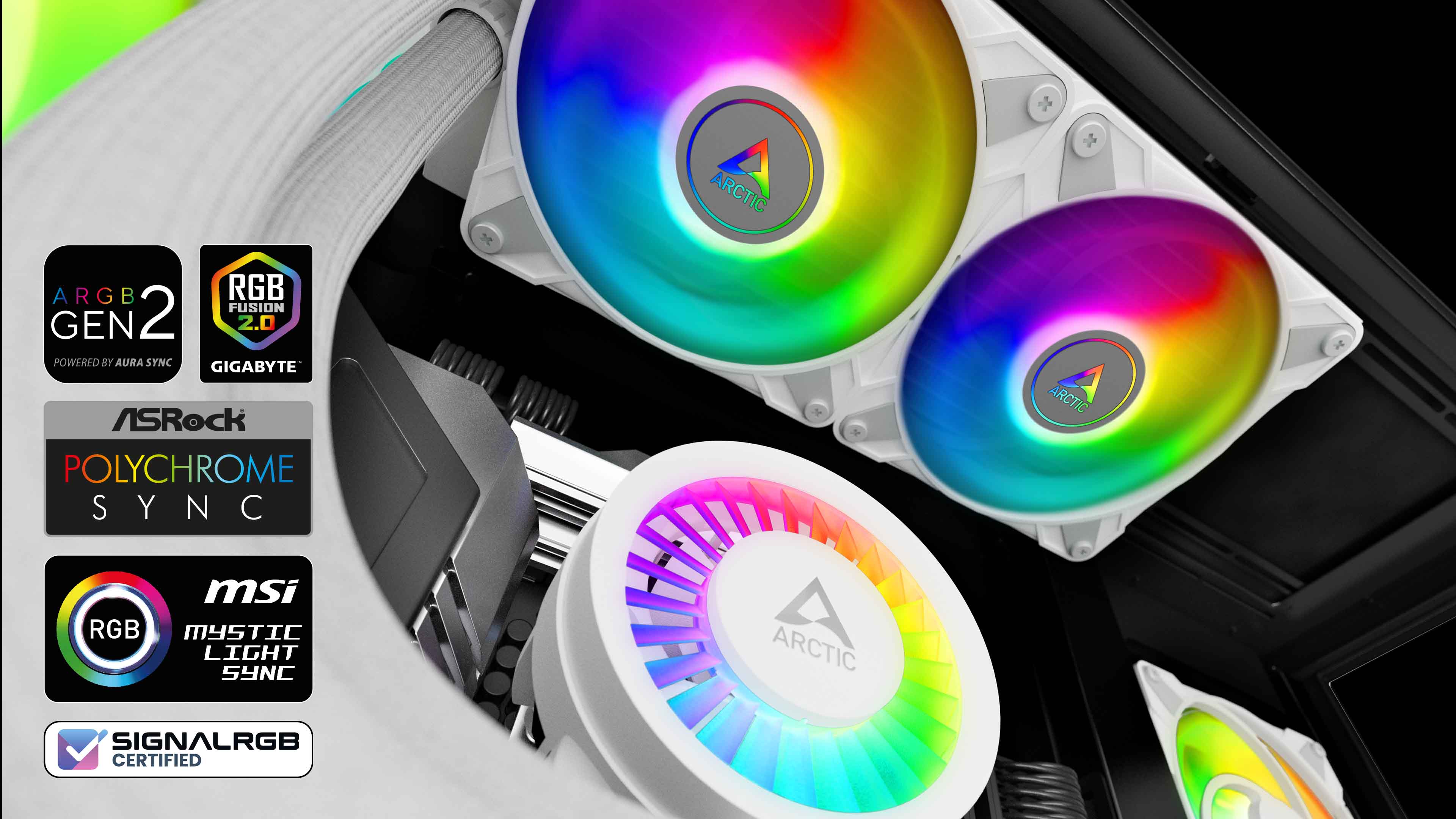 ARCTIC používá místo proprietárních konektorů standardizované 3pinové kabely. To zajišťuje nejen kompatibilitu s většinou osvětlovacích systémů pro základní desky, skříně, ovladače a příslušenství, ale také umožňuje softwarové ovládání s nejběžnějšími řídicími programy. Funkce daisy-chain také zajišťuje, že každá LED může kdykoli zobrazit individuální barvu a nabízí nespočet možností kombinací pro každou preferenci.