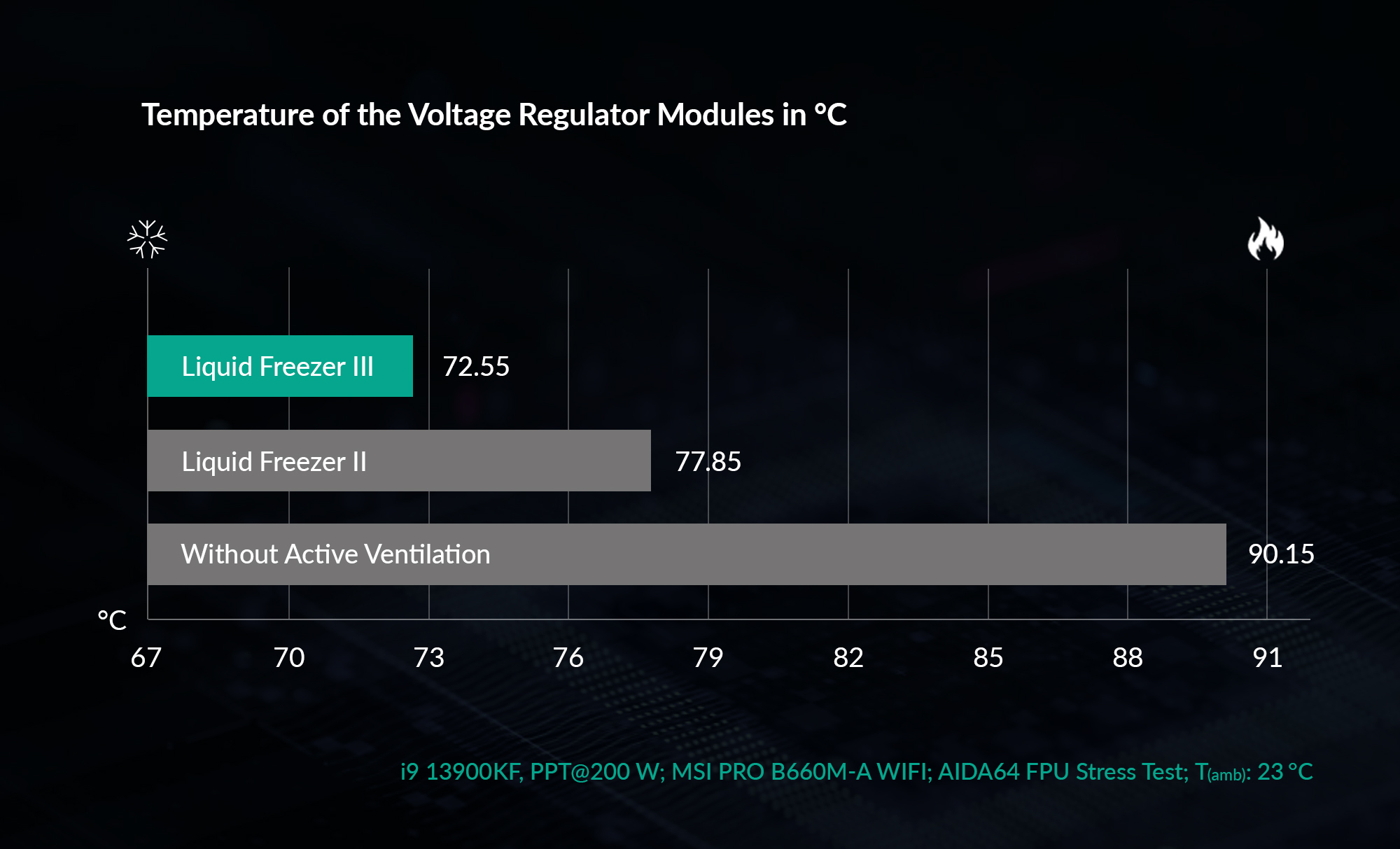 Napěťové měniče základních desek často pracují na maximální teplotu v kombinaci s CPU náročnými na spotřebu energie. Pro kompenzaci nedostatečného proudění vzduchu z věžového chladiče pracuje Liquid Freezer III s přepracovaným ventilátorem VRM. 60mm ventilátor řízený PWM umožňuje téměř tiché chlazení oblasti zásuvky při nedostatečném chlazení VRM, v případech špatného proudění vzduchu nebo zejména při scénářích přetaktování. To umožňuje trvale vyšší zatížení a delší životnost měničů napětí.