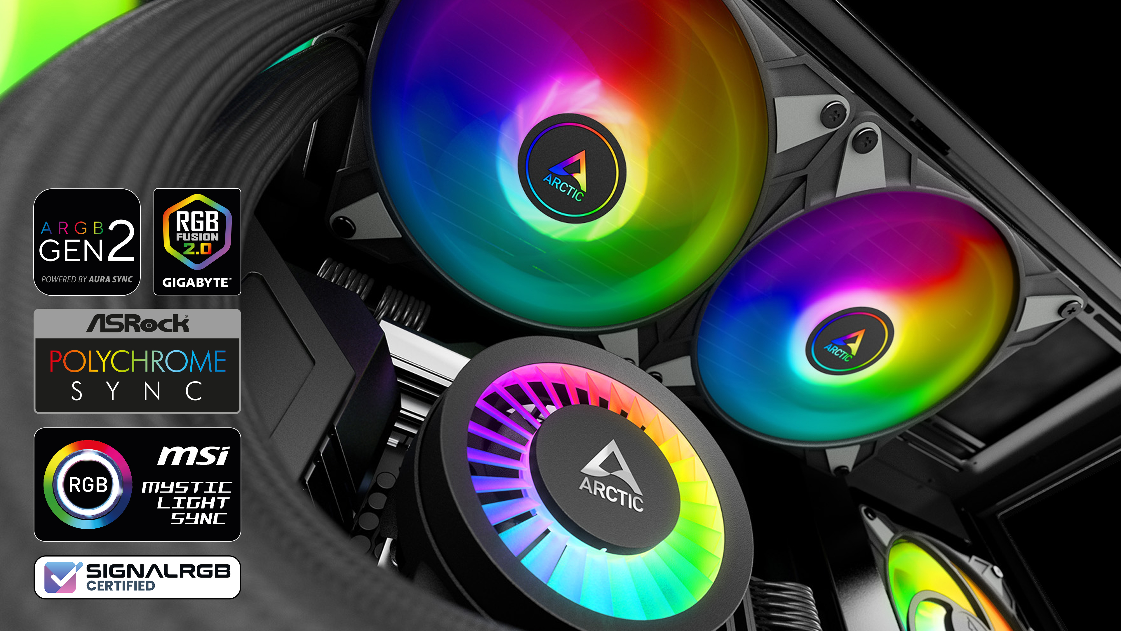 ARCTIC pouĹľĂvá standardizovanĂ© 3pinovĂ© kabely namĂsto proprietárnĂch konektorĹŻ. TĂm je zajištÄ›na nejen kompatibilita s vÄ›tšinou osvÄ›tlovacĂch systĂ©mĹŻ pro základnĂ desky, skĹ™ĂnÄ›, ovladaÄŤe a pĹ™ĂslušenstvĂ, ale takĂ© moĹľnost softwarovĂ©ho ovládánĂ pomocĂ nejběžnÄ›jšĂch Ĺ™ĂdicĂch programĹŻ. Funkce Ĺ™etÄ›zovĂ©ho zapojenĂ takĂ© zajišťuje, Ĺľe kaĹľdá LED dioda mĹŻĹľe kdykoli zobrazit individuálnĂ barvu, coĹľ nabĂzĂ nespoÄŤet moĹľnostĂ kombinacĂ pro kaĹľdou preferenci.