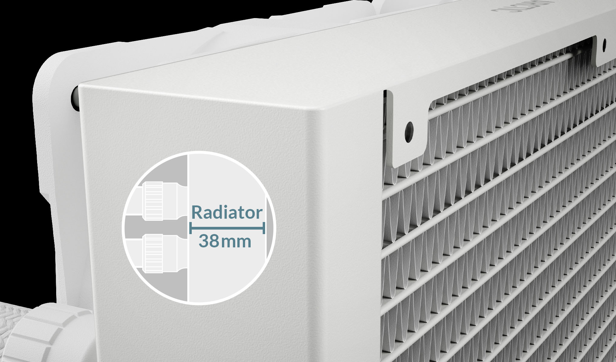 Chladicí plocha chladiče o tloušťce 38 mm byla zvětšena o 23 % díky zvětšenému počtu žeber. To umožňuje nejen lepší odvod tepla, ale také větší objem kapaliny. V důsledku toho se zpomaluje nárůst tepla v systému vodního chlazení a výkonové a teplotní špičky lze účinně zvládat po delší dobu.