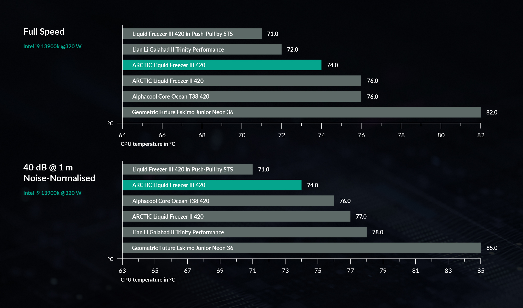 V nezávislých testech Liquid Freezer III jasně vyčnívá nad konkurencí ve všech cenových kategoriích, zejména díky svému vynikajícímu výkonu. V testech normalizovaných na hluk ukazuje Liquid Freezer III svou skutečnou sílu a svým tichým, ale výkonným provozem předčí mnoho konkurentů.