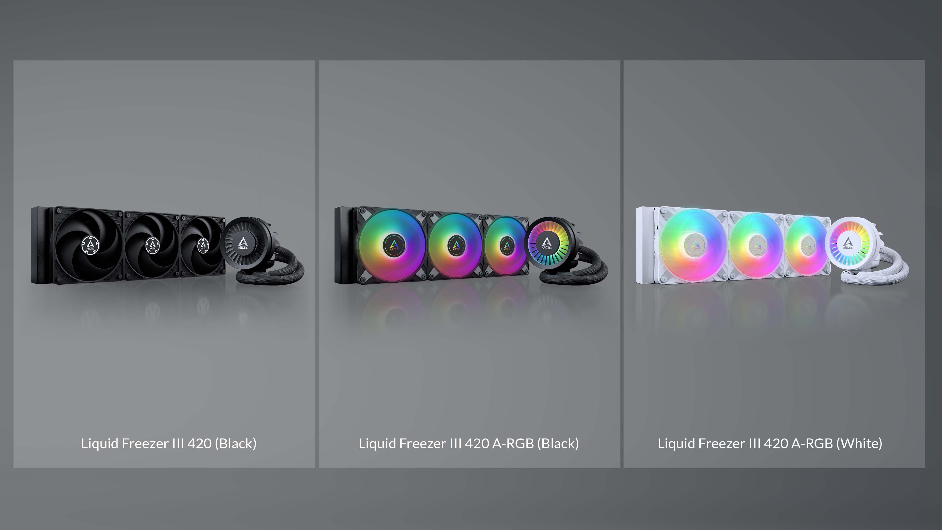 Liquid Freezer III nabízí vynikající chladicí výkon ve čtyřech různých velikostech a třech variantách. Zatímco verze Black je zcela černá, verze A-RGB jsou k dispozici v černé nebo bílé barvě a mají digitálně adresovatelné osvětlení hlavy čerpadla a ventilátorů chladiče. S velikostmi radiátorů 240, 360, 280 a 420 nabízí Liquid Freezer III ideální kombinaci výkonu, technologie a designu pro každého!