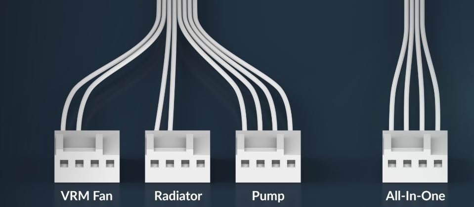 S rozdělovacím kabelem lze čerpadlo, ventilátor VRM a ventilátory chladiče ovládat samostatně nebo synchronizovat pomocí jediného PWM signálu s univerzálním kabelem.