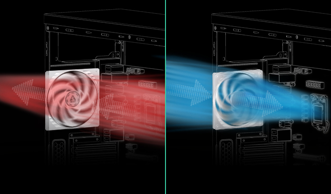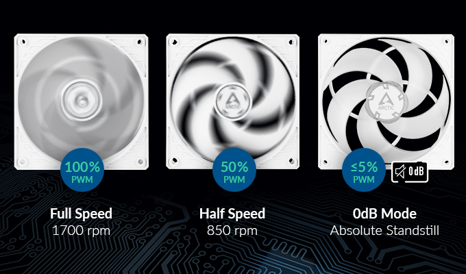 Otáčky ventilátoru lze pomocí PWM snížit až na klidový stav. To umožňuje tichý provoz v režimu IDLE a zároveň zaručuje maximální výkon v případě potřeby.