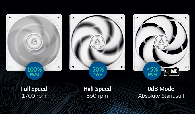 Otáčky ventilátoru lze pomocí PWM snížit až na klidový stav. To umožňuje tichý provoz v režimu IDLE a zároveň zaručuje maximální výkon v případě potřeby.