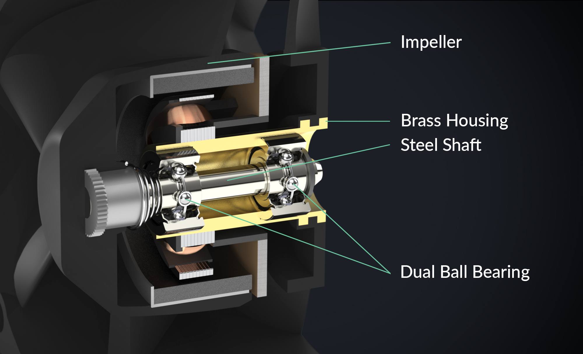 Oběžné kolo modelu S4028-6K je uchyceno dvěma vysoce kvalitními japonskými kuličkovými ložisky v robustním mosazném pouzdře. Tato konstrukce zvyšuje stabilitu, pevnost a kolmost ventilátoru a minimalizuje citlivost na vlivy, jako je teplo a prach. Mosazné pouzdro navíc pomáhá snižovat opotřebení vysokorychlostních ventilátorů.