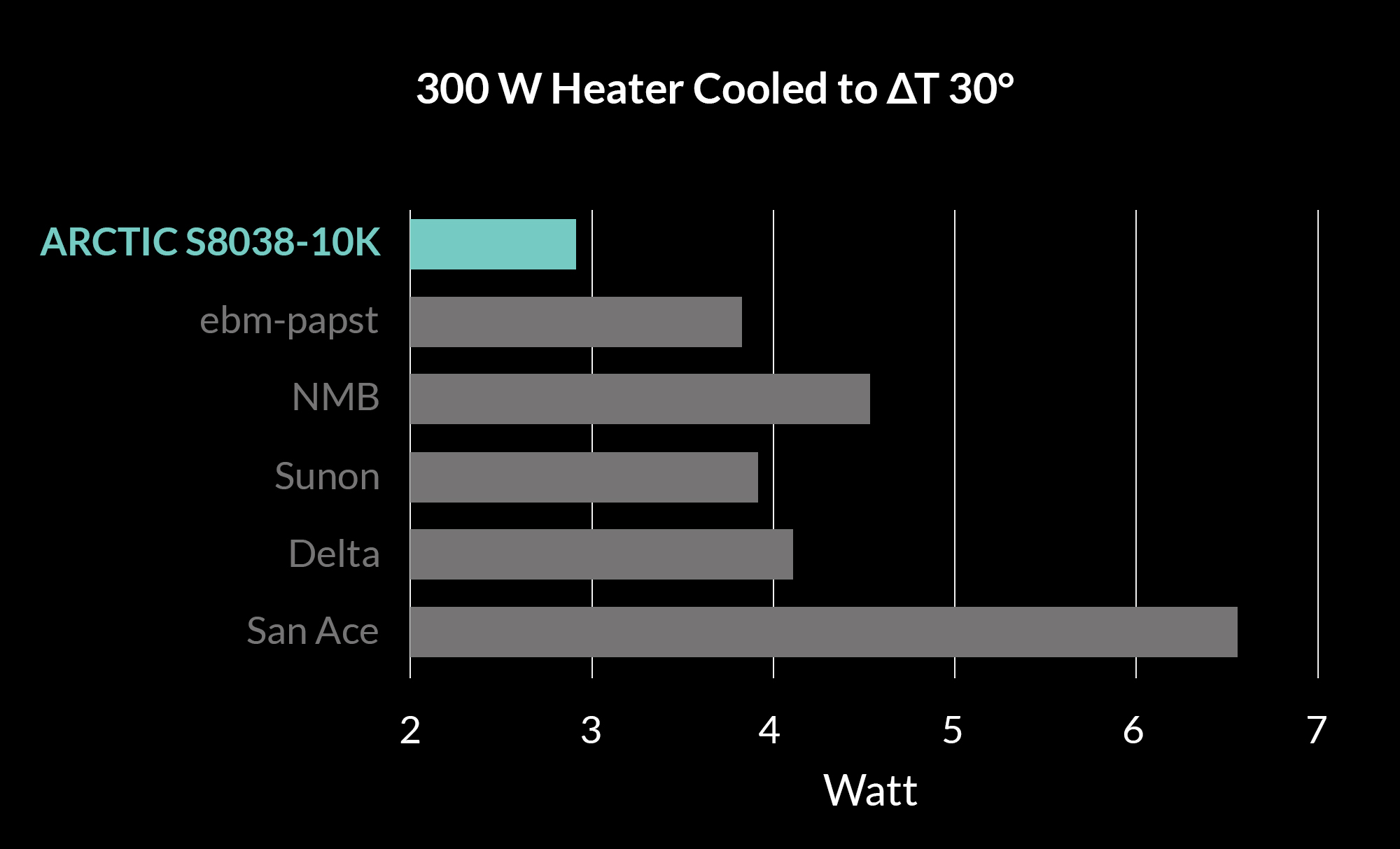 Při stejném výkonu má S8038 o 25 % nižší spotřebu než další nejlepší konkurent, čímž zvyšuje energetickou účinnost vašeho serveru. Snížení spotřeby energie je výsledkem několikaměsíční optimalizace motorů inženýry společnosti ARCTIC s cílem zvýšit účinnost IT zařízení.