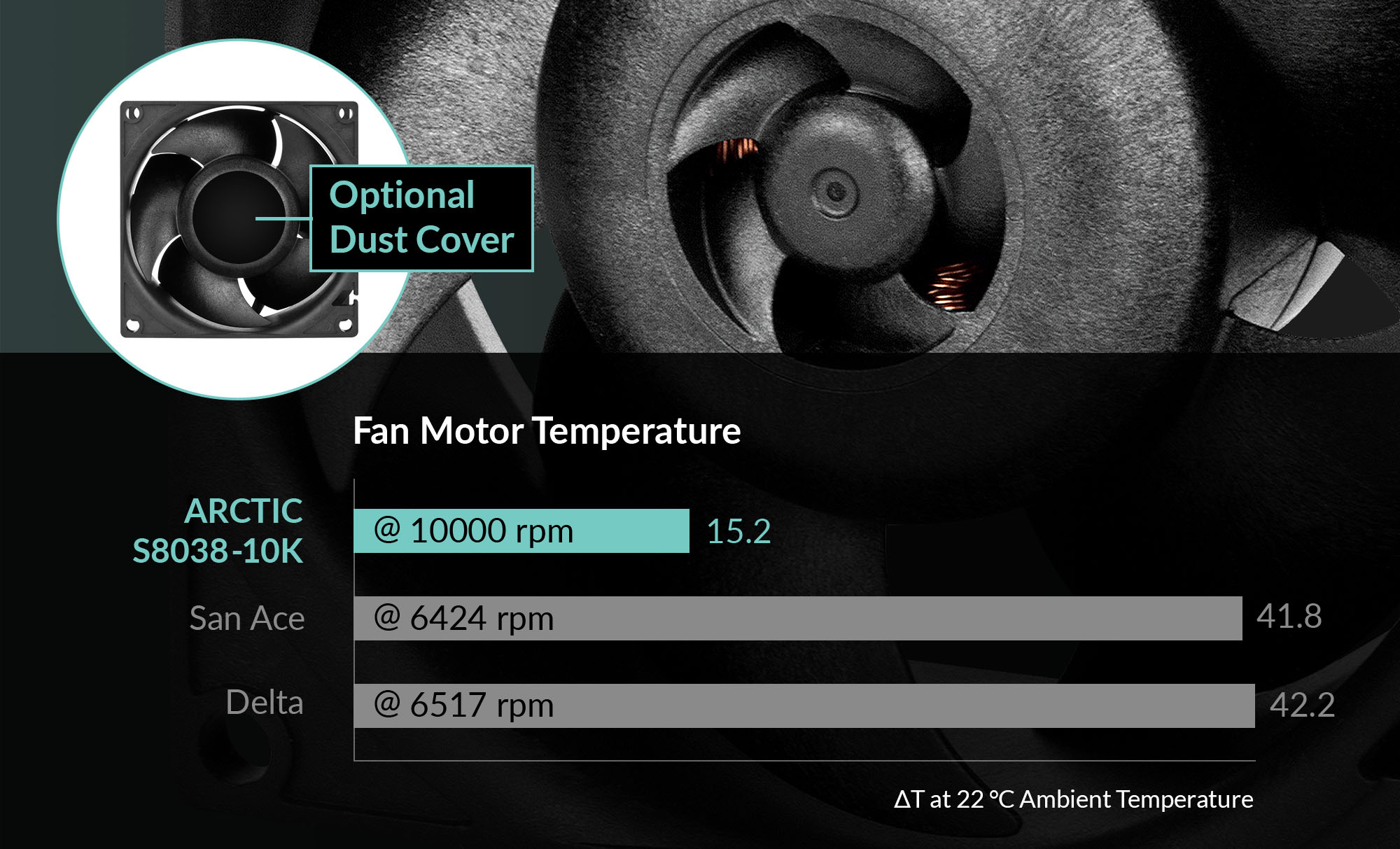 Životnost ventilátorů je většinou dána životností motoru, která je zejména při dlouhodobém provozu výrazně závislá na teplotě motoru. Motor S8038-10K je aktivně chlazen přídavným oběžným kolem v náboji ventilátoru. Udržováním nižších teplot motoru se jeho životnost prodlužuje až o 50 %. Tento pokrok vede nejen ke zlepšení provozní efektivity, ale také k významným úsporám nákladů v dlouhodobém horizontu.