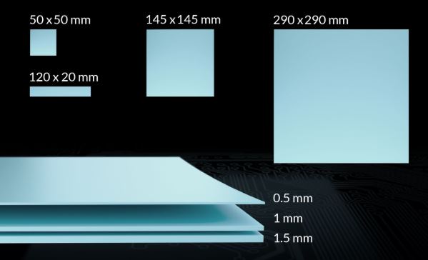 Naše tepelnĂ© podloĹľky jsou k dispozici v tloušťkách 0,5 mm, 1,0 mm a 1,5 mm. DĂky svĂ© štĂhlosti je varianta o tloušťce 0,5 mm vynikajĂcĂ alternativou k tepelnÄ› vodivĂ© fĂłlii. V závislosti na tloušťce podloĹľek jsou k dispozici v rĹŻznĂ˝ch velikostech.