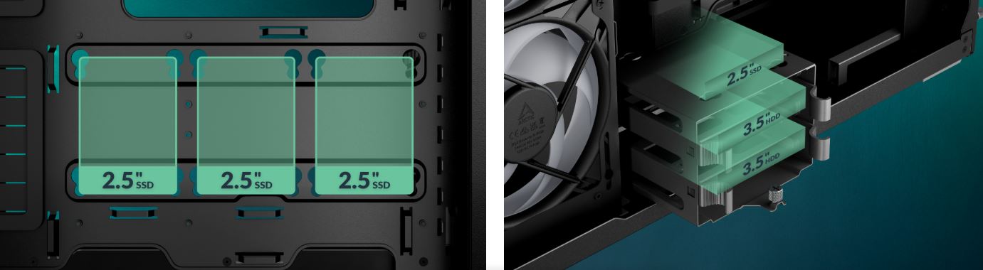 Podporuje tři 2,5" disky za přihrádkou základní desky. Vyjímatelná klec disků poskytuje montážní lišty pro dva 3,5"/2,5" a jeden další 2,5" disk.