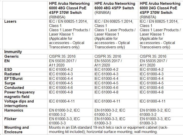 | Emissions | VCCI-CISPR 32, Class A; CNS 13438; ICES-003 Issue 6 Class A; FCC CFR 47 Part 15, Class A; EN 55032: 2015 +AC:2016 / CISPR-32, Class A |