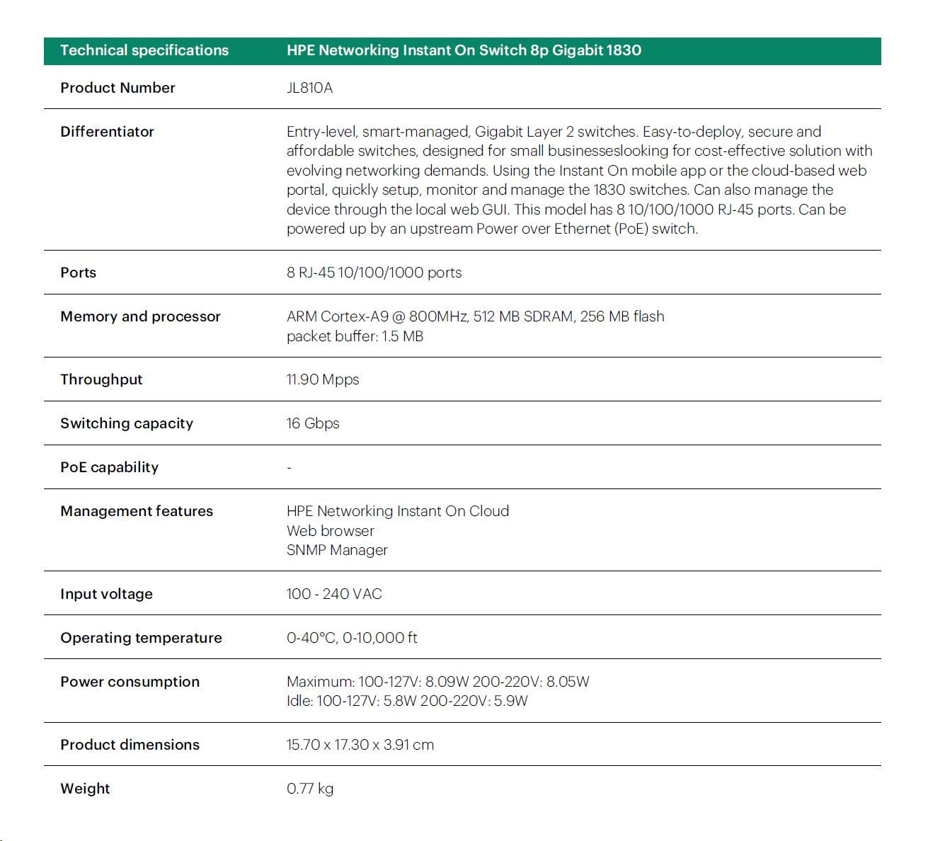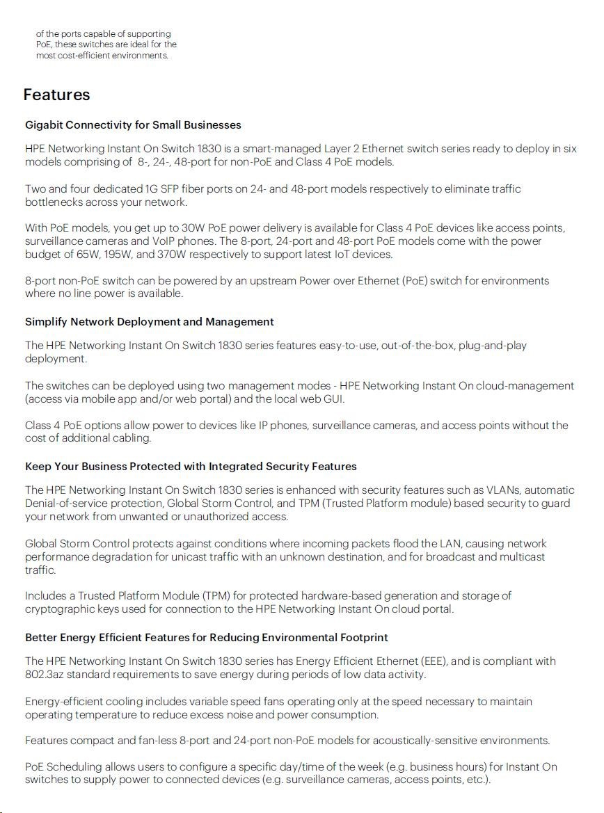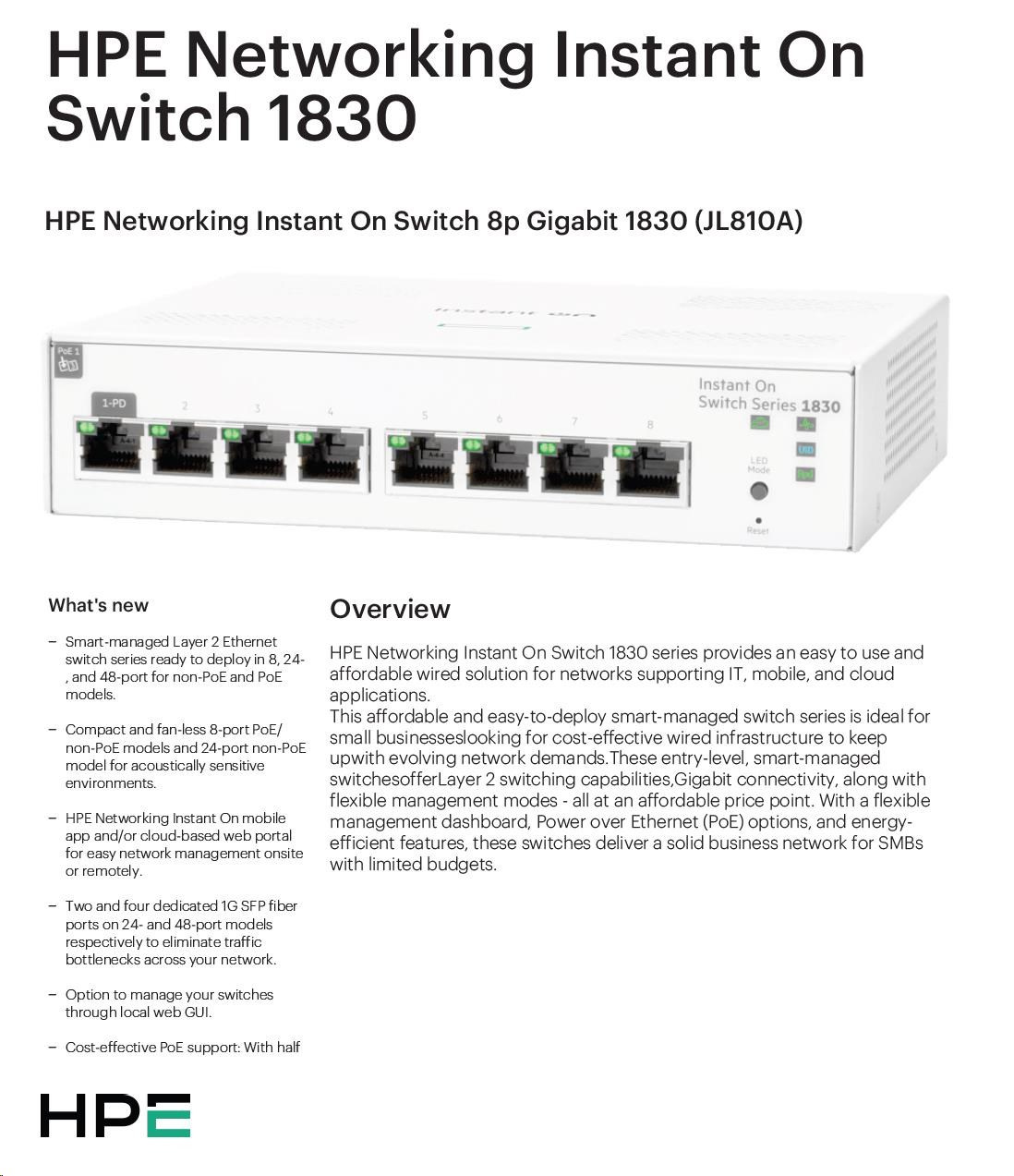 |   Aruba Instant On 1830 8G Switch (JL810A)  |    Aruba Instant On 1830 8G 4p Class4 PoE 65W Switch (JL811A)  |    Aruba Instant On 1830 24G 2SFP Switch (JL812A)  |    Aruba Instant On 1830 24G 12p Class4 PoE 2SFP 195W Switch (JL813A)  |    Aruba Instant On 1830 48G 4SFP Switch (JL814A)  |    Aruba Instant On 1830 48G 24p Class4 PoE 4SFP 370W Switch (JL815A)  |  ||||||||