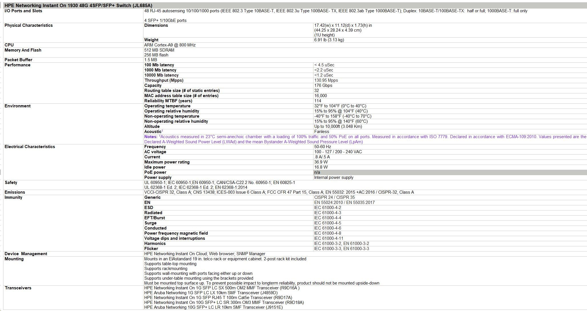 | Transceivers | Aruba Instant On 1G SFP LC SX 500m OM2 MMF Transceiver (R9D16A ) Aruba 1G SFP LC LX 10km SMF Transceiver (J4859D) Aruba Instant On 1G SFP RJ45 T 100m Cat5e Transceiver (R9D17A) Aruba Instant On 10G SFP+ LC SR 300m OM3 MMF Transceiver (R9D18A) Aruba 10G SFP+ LC LR 10km SMF Transceiver (J9151E) | |