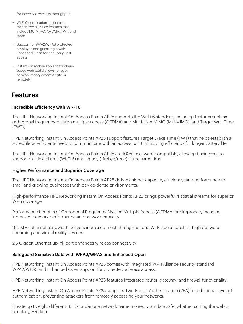 | Next-Generation 802.11ax Wi-Fi Features AP25 is a Wi-Fi CERTIFIED 6TM (Wi-Fi 6) access point that brings higher capacity, efficiency, and performance to small and growing businesses with dense deployments. With a maximum aggregate data rate of 5.3 Gbps, AP25 access points deliver the speed and reliability small businesses need. 2.5g Ethernet Uplink Port And 160mhz Client Bandwidth Support Availability of 2.5G uplink port and wider channel bandwidth delivers faster Wi-Fi speeds for activities like high-def video streaming and gaming. 160mhz Client Bandwidth Support With 160MHz bandwidth support in 11ax, HE160 mode delivers higher performance with 160MHz supported clients. The mesh performance can be doubled with the 160MHz bandwidth support on 5GHz backhaul. Orthogonal Frequency-Division Multiple Access (OFDMA) Allows access points (APs) to handle multiple Wi-Fi 6-capable clients on each channel simultaneously - regardless of device or traffic type. This improves efficiency by boosting overall capacity while reducing latency. Target Wake Time (TWT) Ideal for devices that communicate infrequently, TWT establishes a schedule for clients to communicate with an AP. This helps reduce power consumption, extending battery life.