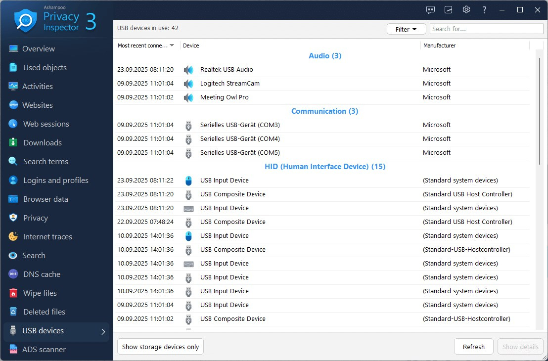 Mějte kontrolu nad každým USB zařízením, které bylo kdy připojeno k vašemu počítači. Ashampoo Privacy Inspector poskytuje podrobné informace o použitých USB flash diskech, discích a dalších zařízeních a ukazuje přesně, kdy byly poprvé a naposledy připojeny. Okamžitě zjistěte, která zařízení přistupovala k vašemu systému, například zda byl v počítači použit neznámý USB flash disk!