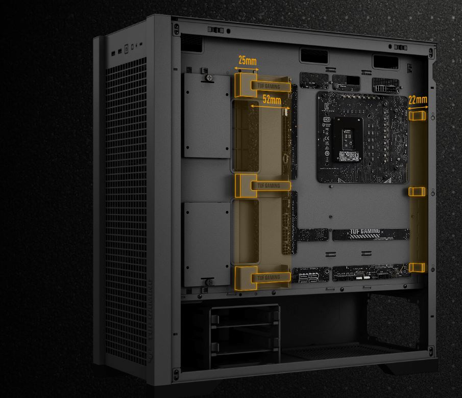 I přes kompaktní rozměry se do něj vejdou ty nejsilnější základní desky a grafické karty. Podporuje také základní desky ASUS se skrytými konektory.