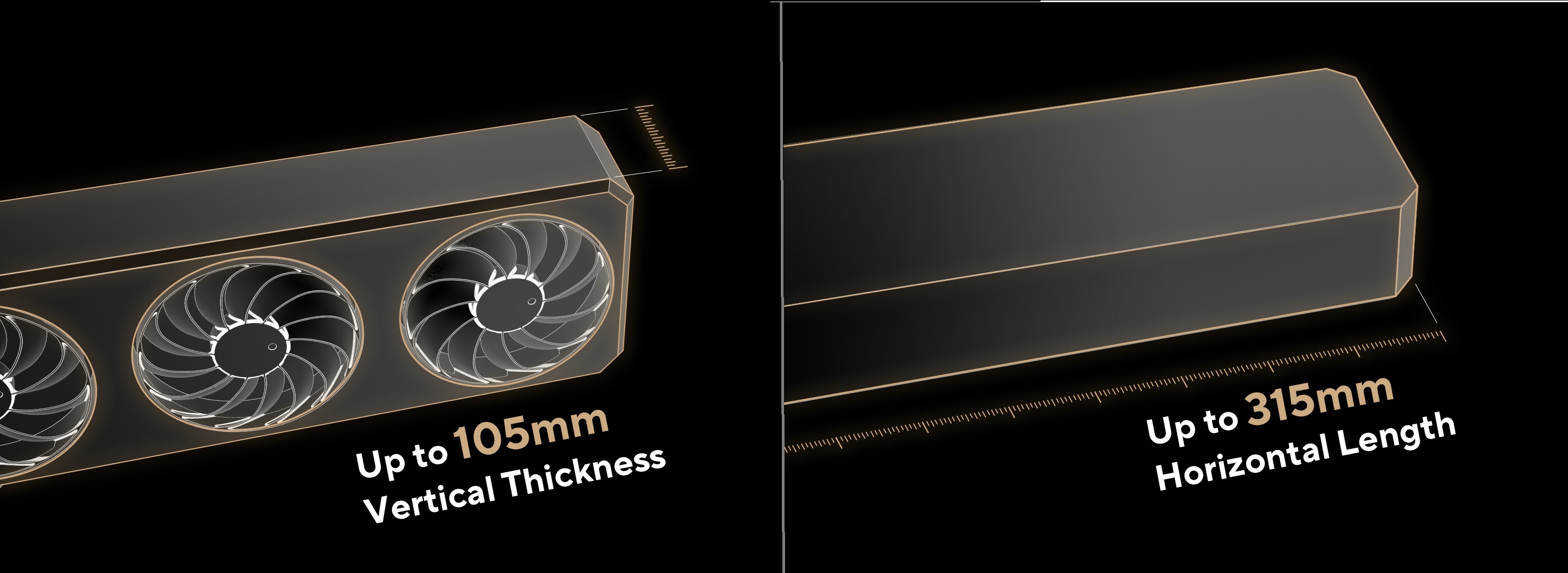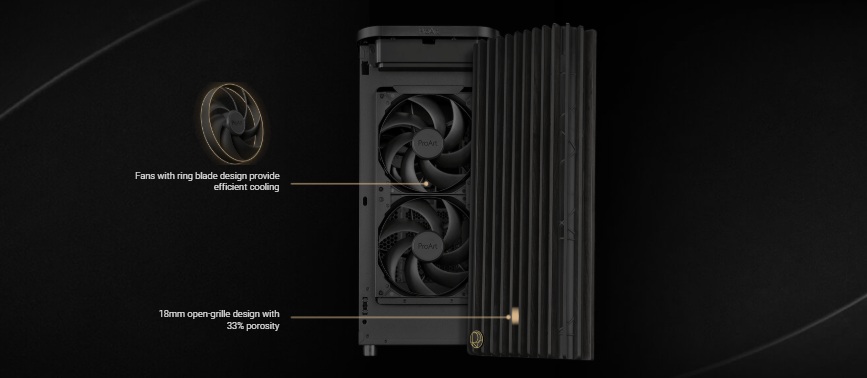 ProArt PA401 Wood Edition je vybaven dvěma předinstalovanými 160mm předními ventilátory a umožňuje horizontální i vertikální montáž grafické karty.