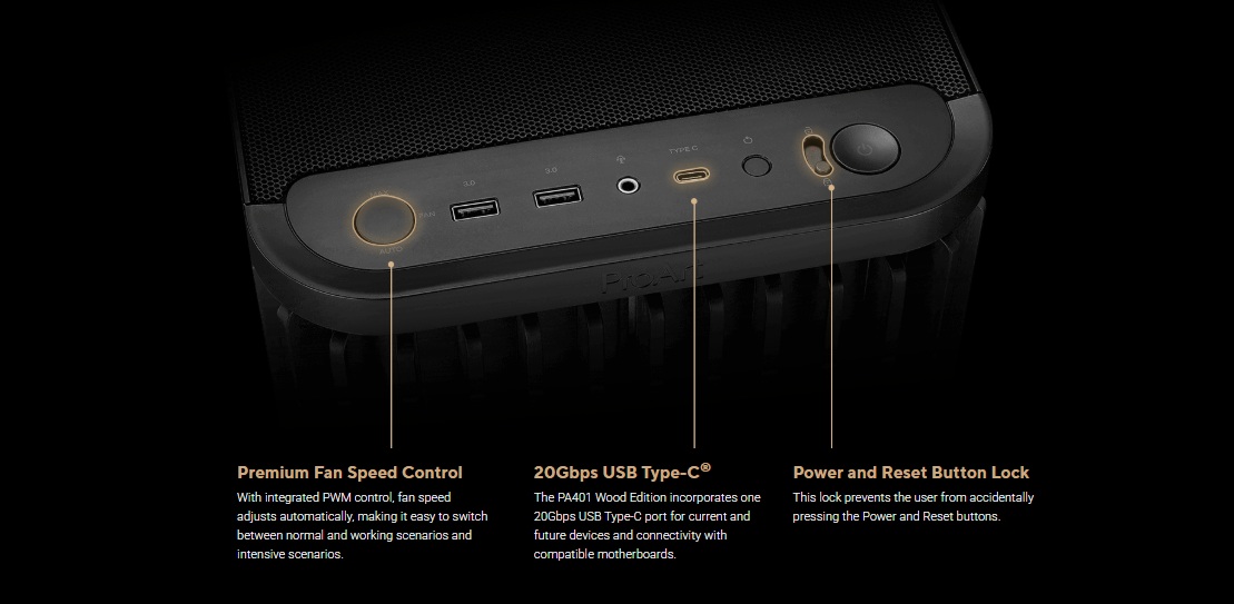 PA401 Wood Edition je vybaven přední mřížkou s 33% porézností, která maximalizuje proudění vzduchu a ventilaci. Vestavěné duální 160mm přední ventilátory zároveň účinně dodávají grafickým kartám a chladičům CPU proud vzduchu až 138 cfm, přičemž vnější prstenec spojující lopatky ventilátorů pomáhá snižovat počáteční vibrace. Přední ventilátory a 120mm zadní ventilátor s PWM ovládáním zajišťují optimální proudění vzduchu, nízkou hlučnost, nízké vibrace a vysokou spolehlivost.