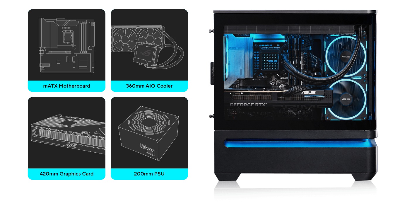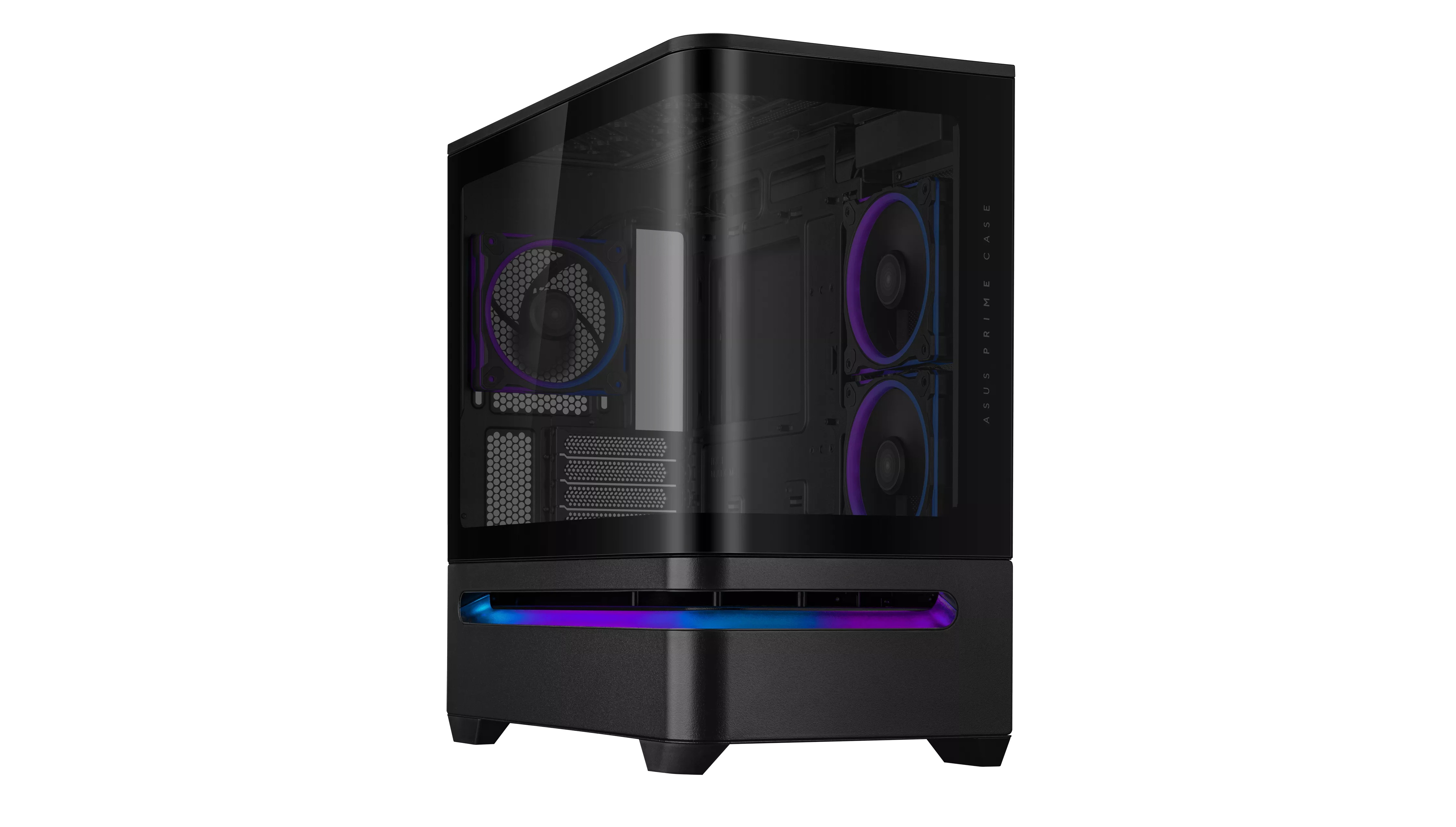 ASUS Prime AP202 ARGB je univerzální panoramatická skříň mATX navržená tak, aby stylově prezentovala komponenty systému. Zakřivený panel z tvrzeného skla plynule přechází z přední strany na boční stranu a nabízí nádherný výhled na komponenty téměř z každého úhlu. Patentovaný slotový ventilátor zajišťuje optimální chlazení grafické karty a integrovaný světelný pásek ARGB hladce spolupracuje s technologií Aura Sync.