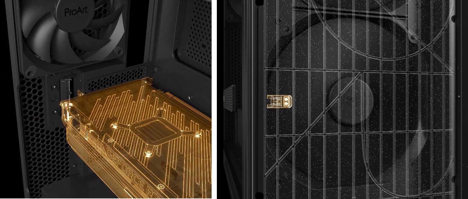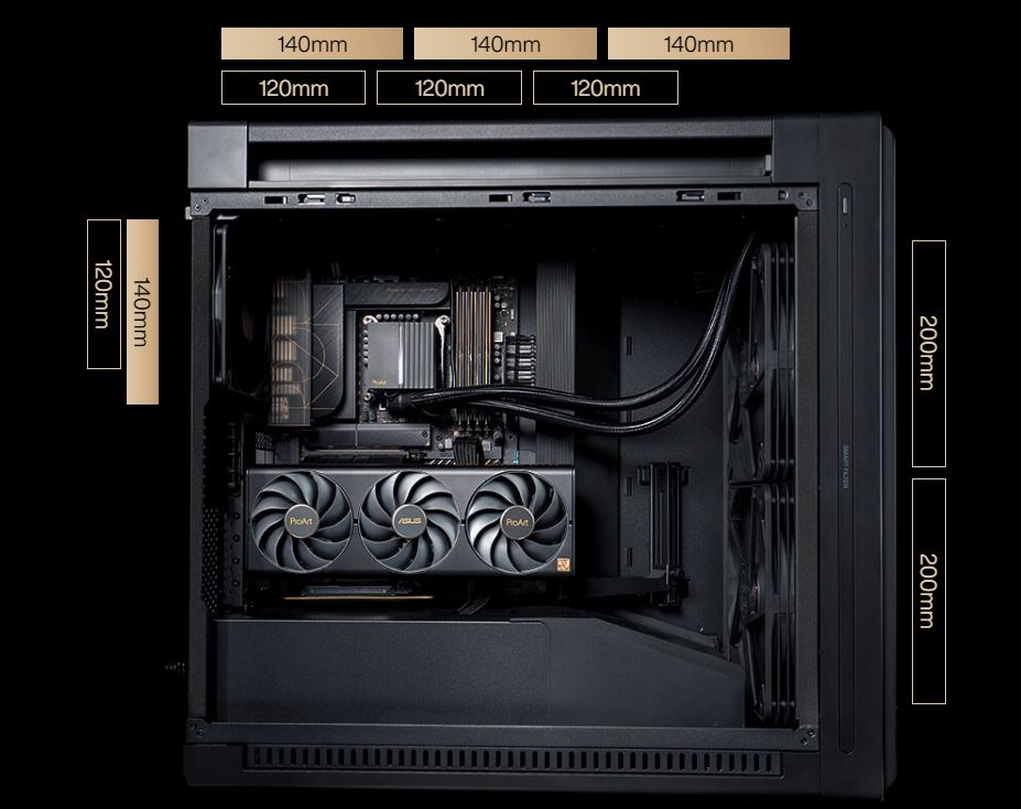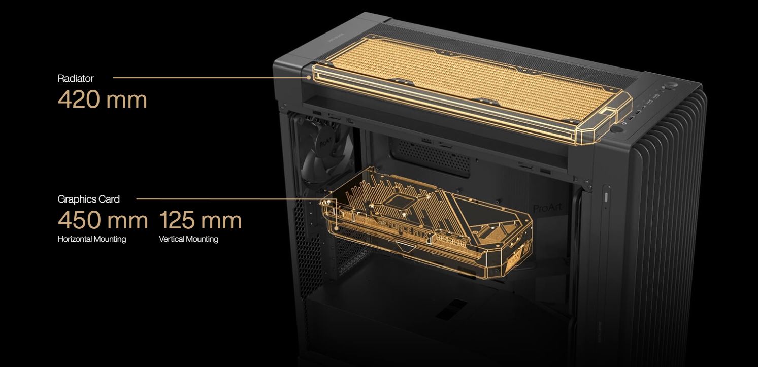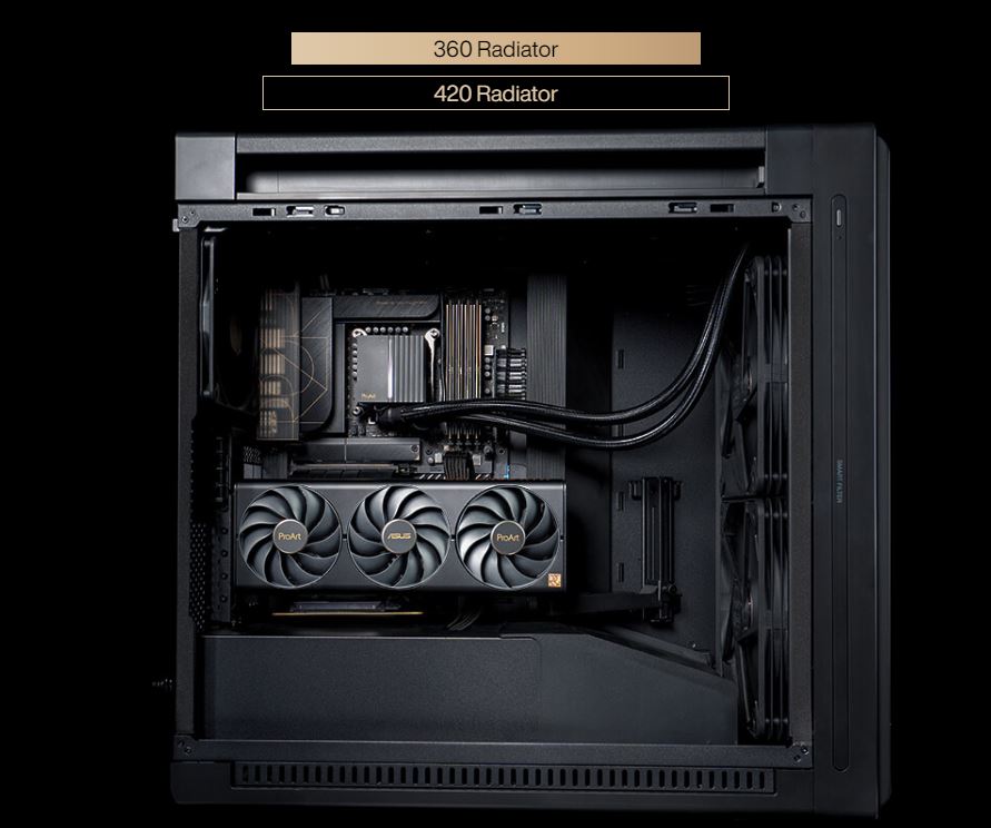 ProArt PA602 podporuje jeden 420mm radiátor pro AIO chlazení nebo vlastní smyčky kapalinového chlazení. Poskytuje také dostatek prostoru pro nejsilnější grafické karty v horizontální i vertikální montážní poloze.