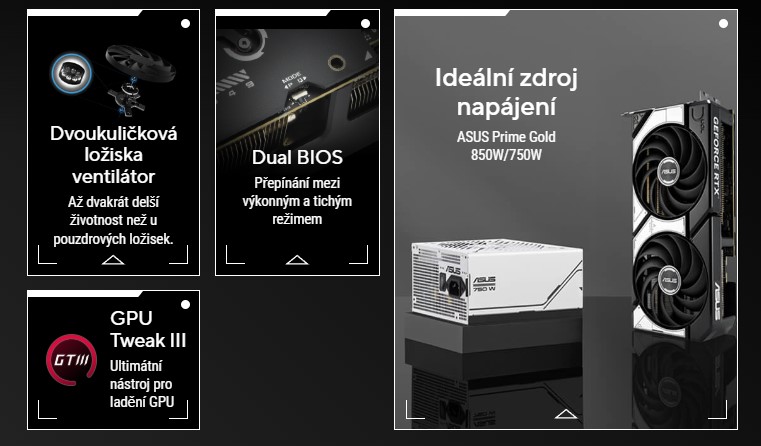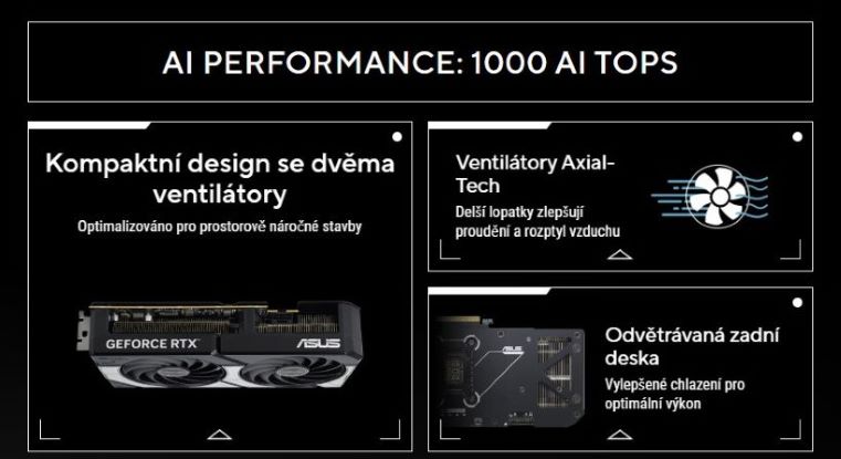 ASUS Dual GeForce RTX 5070 kombinuje vysokĂ˝ tepelnĂ˝ vĂ˝kon s širokou kompatibilitou. PokroÄŤilá Ĺ™ešenĂ chlazenĂ z vlajkovĂ˝ch grafickĂ˝ch karet - vÄŤetnÄ› dvou ventilátorĹŻ Axial-tech pro optimalizaci proudÄ›nĂ vzduchu k chladiÄŤi. NavrĹľeno s kompaktnĂm profilem, kterĂ˝ poskytuje vĂce vĂ˝konu na menšĂm prostoru. DĂky tÄ›mto vylepšenĂm je ASUS Dual ideálnĂ volbou pro hráče, kteřà chtÄ›jĂ těžkĂ˝ grafickĂ˝ vĂ˝kon v kompaktnĂ sestavÄ›.