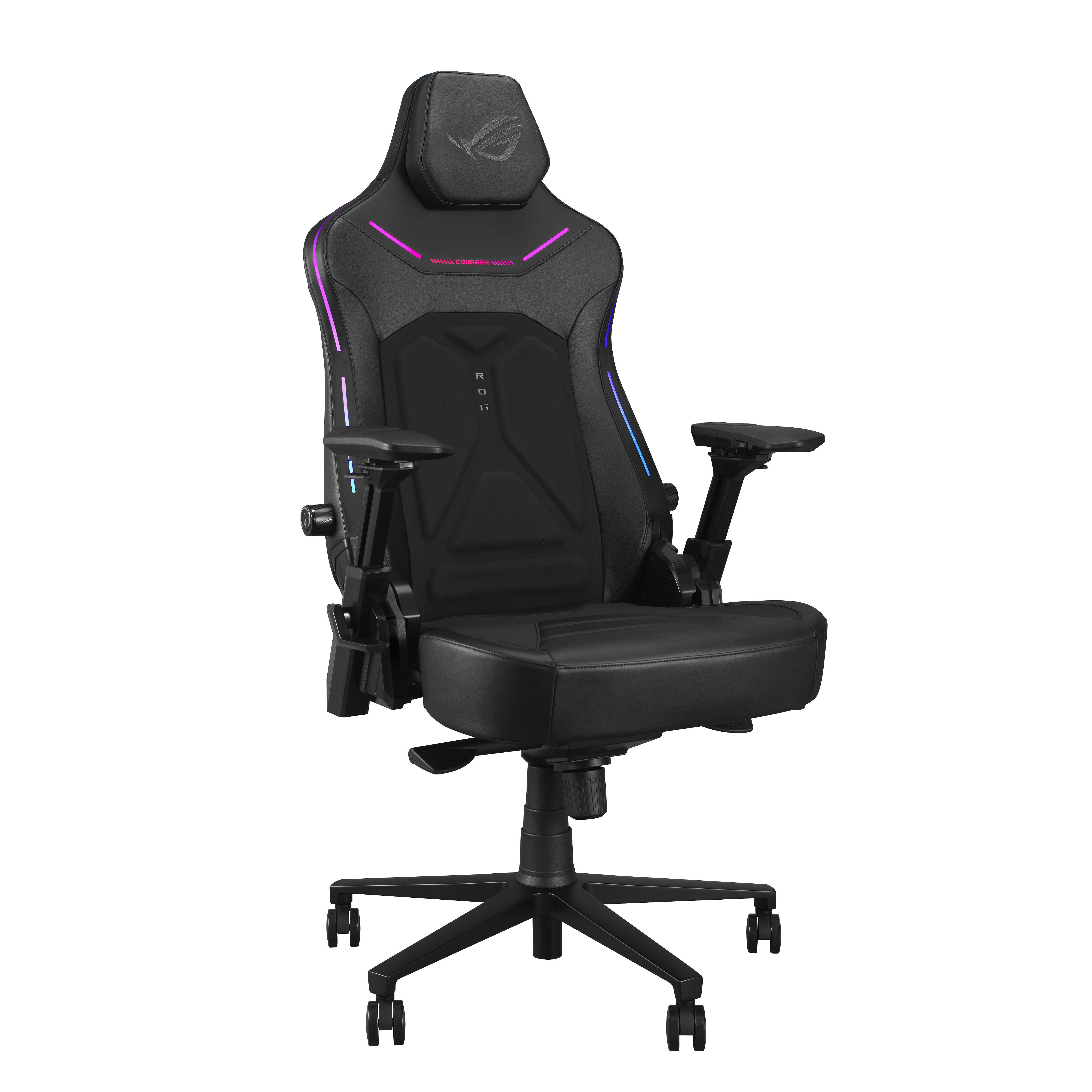 Herní židle ROG Courser s nastavitelnou bederní opěrkou lisovanou za studena pro podporu a proudění vzduchu, 4D područkami, ultraširokým sedákem, magnetickou opěrkou hlavy, dynamickým synchronizovaným systémem sklápění a osvětlením Aura RGB