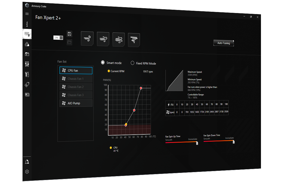 Software ASUS Fan Xpert 2+ poskytuje komplexnĂ kontrolu nad ventilátory. ReĹľim automatickĂ©ho ladÄ›nĂ inteligentnÄ› konfiguruje všechny parametry jedinĂ˝m kliknutĂm. K dispozici je takĂ© reĹľim Extreme Quiet, kterĂ˝ sniĹľuje otáčky ventilátorĹŻ šasi pod vĂ˝chozĂ minimum, aby byl systĂ©m pĹ™i nenároÄŤnĂ˝ch Ăşlohách tichĂ˝ jako šepot. Ventilátory lze ovládat takĂ© prostĹ™ednictvĂm systĂ©mu UEFI BIOS.