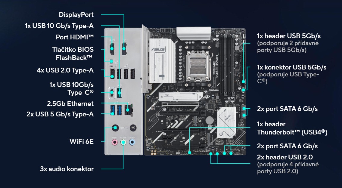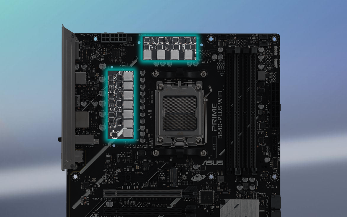 PRIME B840-PLUS WIFI nabĂzĂ 8+2+1fázovĂ© napájenĂ se samostatnĂ˝mi tranzistory MOSFET, kterĂ© zajišťujĂ efektivnĂ a stabilnĂ napájenĂ procesorĹŻ AMD a stálĂ˝ vĂ˝kon pro kaĹľdodennĂ pouĹľĂvánĂ.