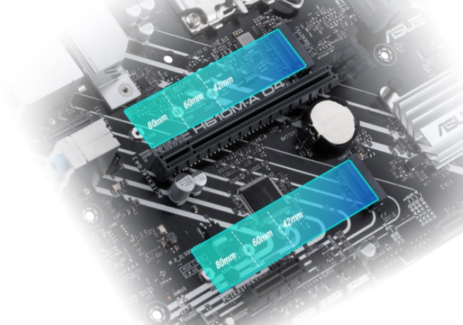Prime H610M-A D4 nabízí dva sloty M.2, které podporují rychlost přenosu dat až 32 Gb/s prostřednictvím PCIe 3.0, což umožňuje rychlejší spouštění a načítání aplikací s disky operačního systému nebo aplikací.