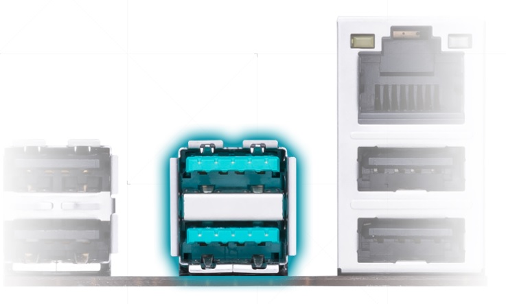 Početné porty USB podporují špičkové sestavy nabité periferními zařízeními, včetně portů USB typu A na zadním panelu s rychlým rozhraním USB 3.2 Gen 2 pro přenosové rychlosti až 10 Gb/s.