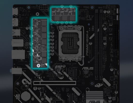 Stabilní napájení je zásadní pro maximální výkon procesorů Intel® Core™ Ultra (Series 2). Model PRIME H810M-A-CSM má 6+1+1+1 fází se samostatnými tranzistory MOSFET, což zajišťuje efektivní a stabilní napájení procesorů Intel® a stálý výkon pro běžné používání.