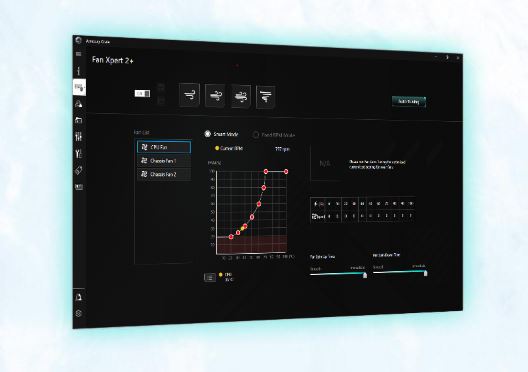 Software ASUS Fan Xpert 2+ poskytuje komplexní kontrolu nad ventilátory. Režim automatického ladění inteligentně nastaví všechny parametry jediným kliknutím. K dispozici je také extrémně tichý režim, který snižuje otáčky ventilátorů šasi pod výchozí minimum, aby byl systém při nenáročných úlohách tichý jako šepot. Ventilátory lze ovládat také prostřednictvím systému UEFI BIOS.