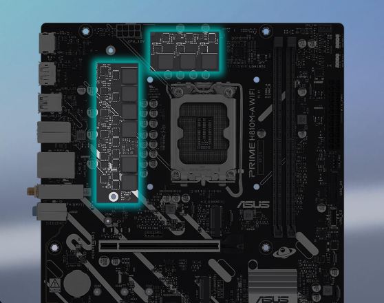 Stabilní napájení je zásadní pro maximalizaci výkonu procesorů Intel® Core™ Ultra (řada 2). PRIME H810M-A WIFI se vyznačuje fázovým designem 6+1+1+1 s diskrétními MOSFETy, což zajišťuje efektivní a stabilní dodávku energie pro procesory Intel® a stabilní výkon pro každodenní použití.
