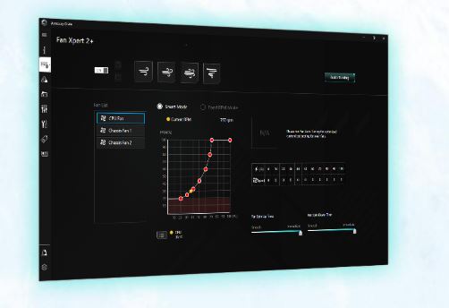 Software ASUS Fan Xpert 2+ poskytuje komplexní kontrolu nad ventilátory. Režim automatického ladění inteligentně konfiguruje všechny parametry jediným kliknutím. K dispozici je také režim Extreme Quiet, který snižuje otáčky ventilátoru šasi pod výchozí minimum, aby byl váš systém při provádění lehkých úkolů tichý. Ventilátory lze také ovládat přes UEFI BIOS.