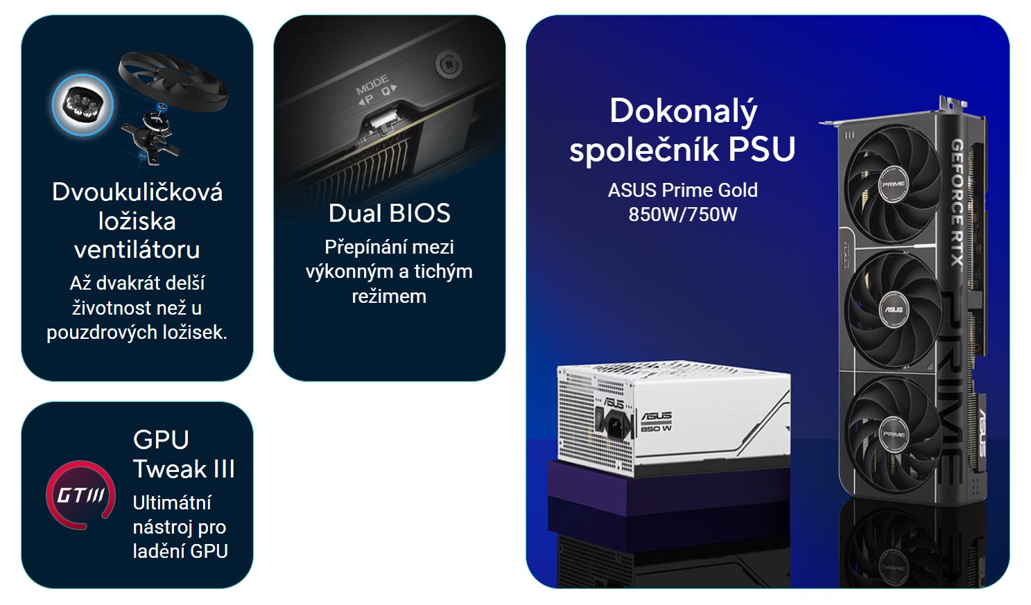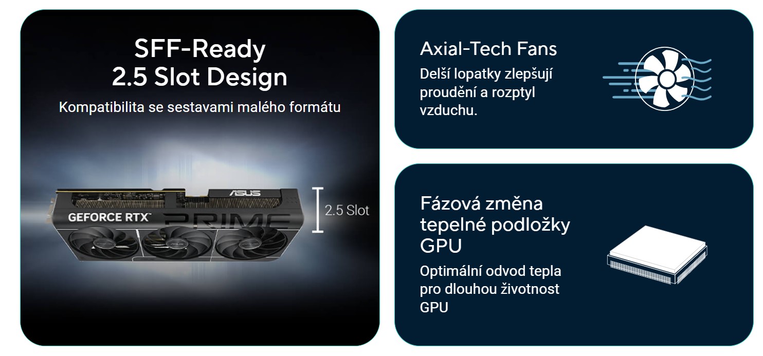 Prime RTX 5070 má 2,5 slotový design s pečlivě uspořádaným rozložením krytu, chladiče a tepelných trubic, aby tři ventilátory Axial-tech mohly využít ventilaci bočního panelu šasi a zajistit optimální tepelný výkon.