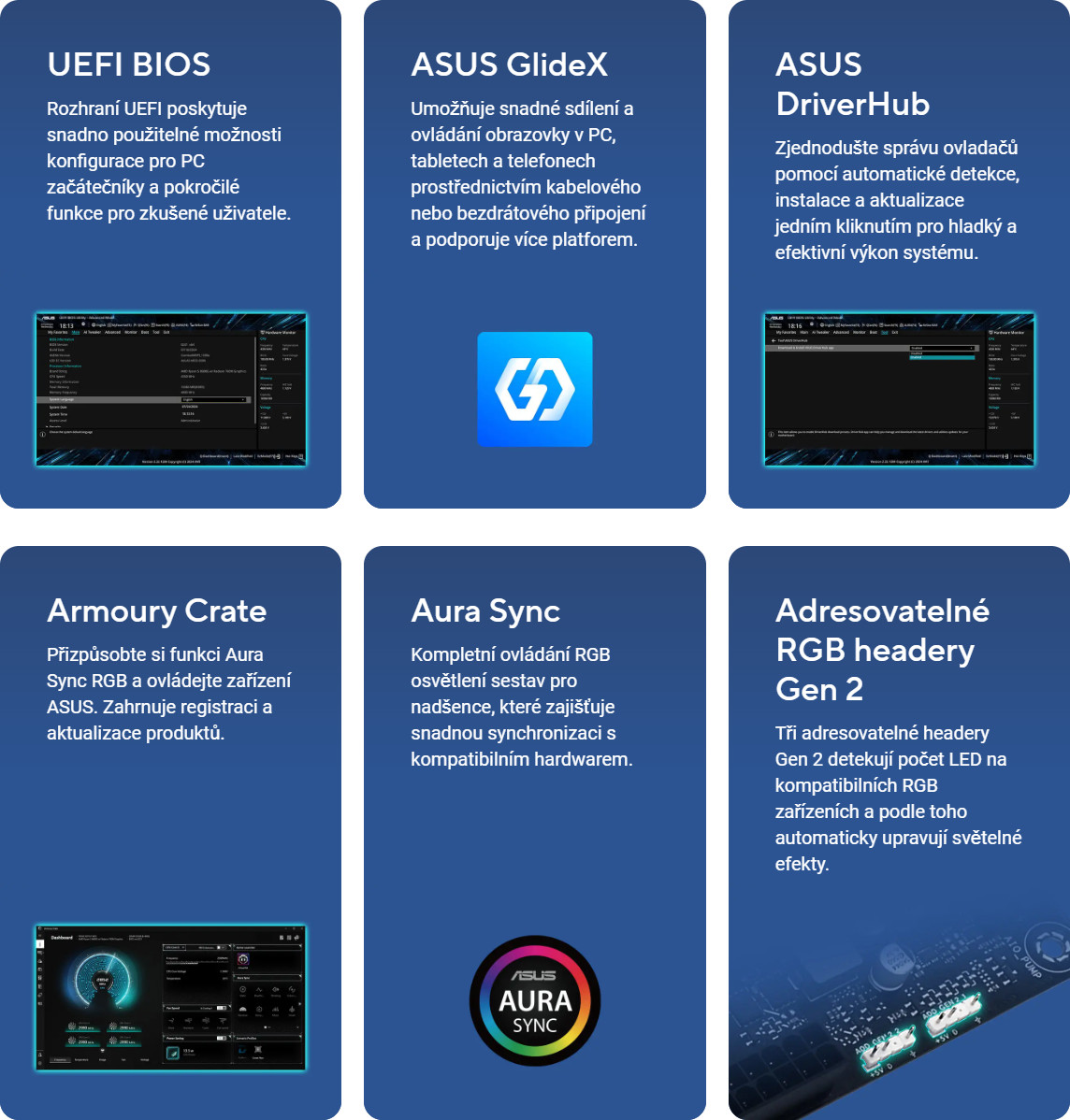PRIME X870-P WIFI zlepšuje uživatelský komfort ve všech oblastech, od zjednodušení úprav nastavení systému BIOS až po přizpůsobitelné ovládání RGB osvětlení, což přináší jedinečný vzhled sestavy.