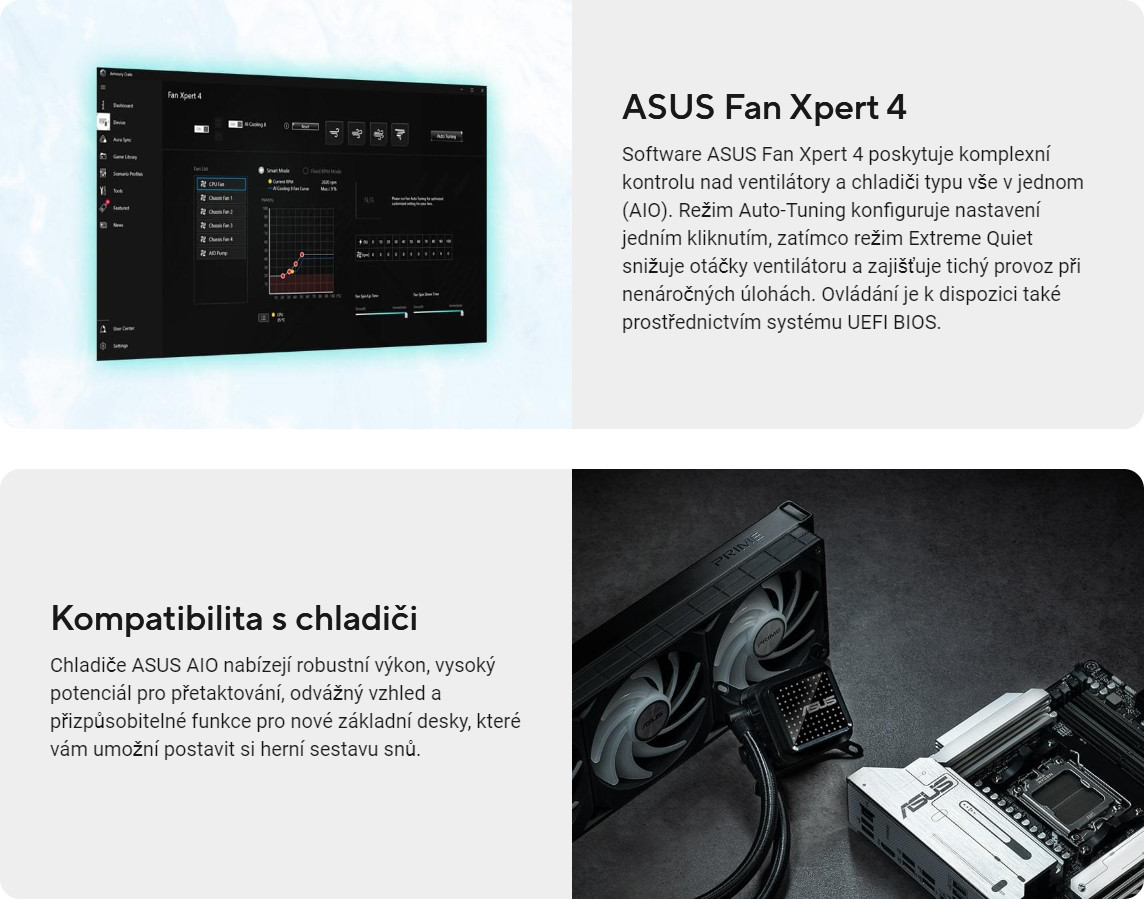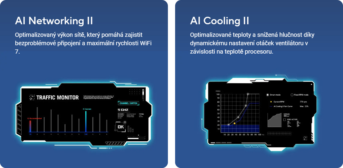 Řešení ASUS AI Solutions, včetně AI Networking II pro optimalizaci šířky pásma v reálném čase a AI Cooling II pro regulaci teploty, nabízejí novou úroveň ultrarychlého připojení, výkonu a účinného chlazení.