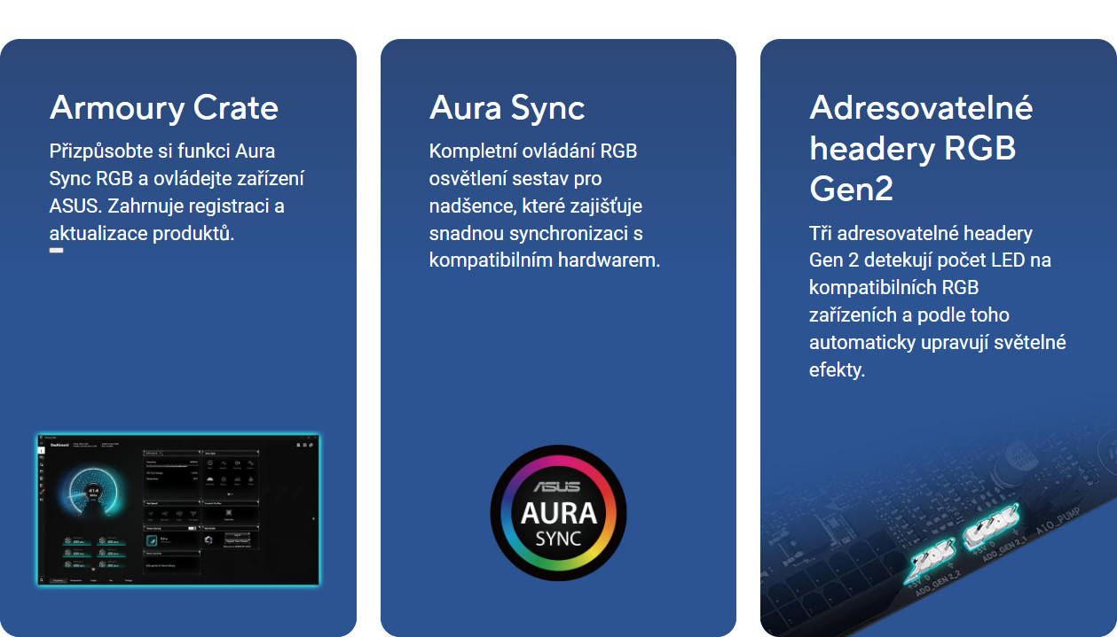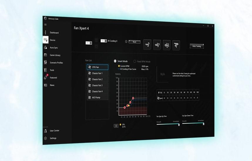Software ASUS Fan Xpert 4 poskytuje komplexní kontrolu nad ventilátory a chladiči typu vše v jednom (AIO). Režim Auto-Tuning konfiguruje nastavení jedním kliknutím, zatímco režim Extreme Quiet snižuje otáčky ventilátoru a zajišťuje tichý provoz při nenáročných úlohách. Ovládání je k dispozici také prostřednictvím systému UEFI BIOS.
