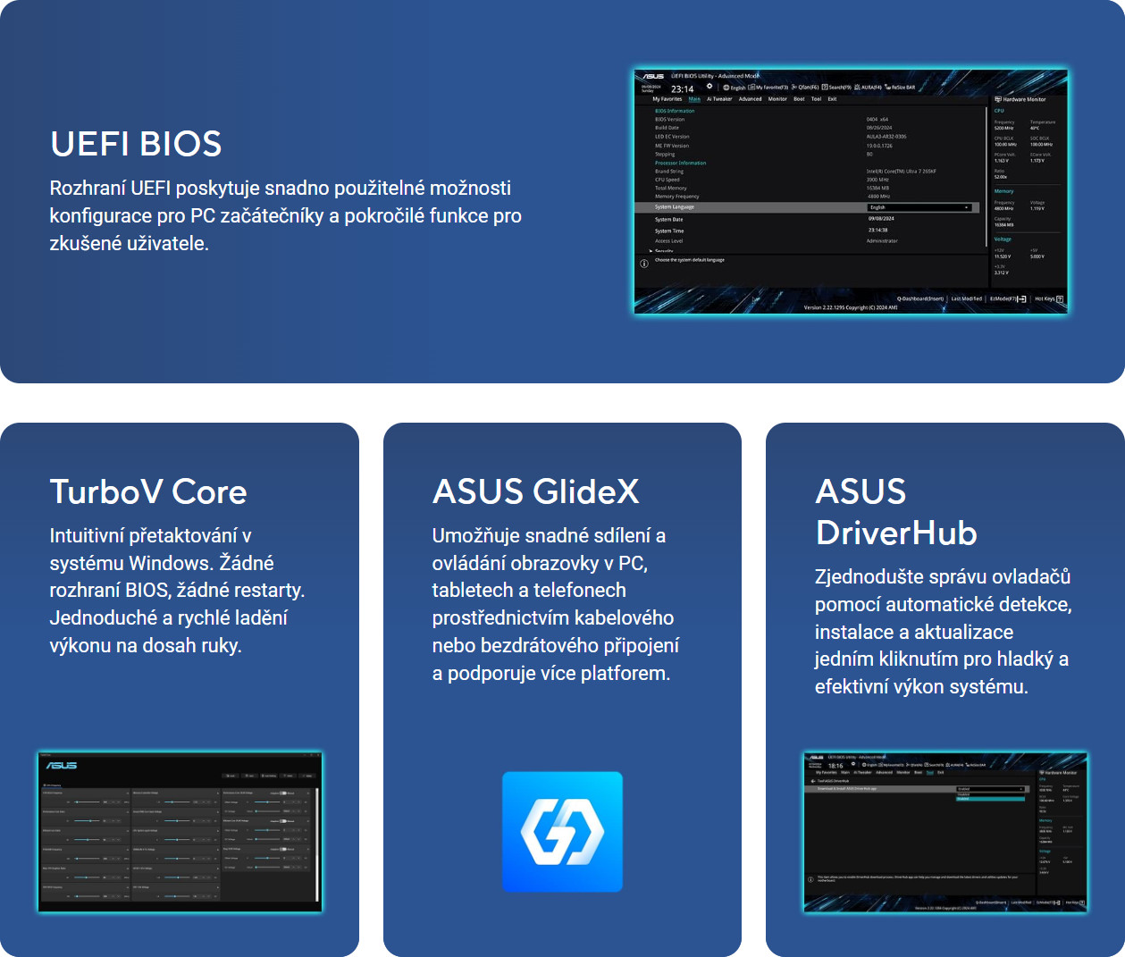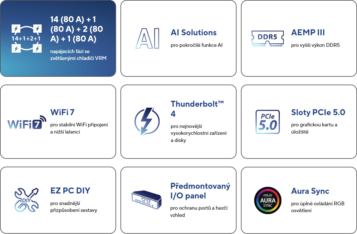 PRIME Z890-P WIFI zlepšuje uživatelský komfort ve všech oblastech, od zjednodušení úprav nastavení systému BIOS až po přizpůsobitelné ovládání RGB osvětlení, což přináší jedinečný vzhled sestavy.