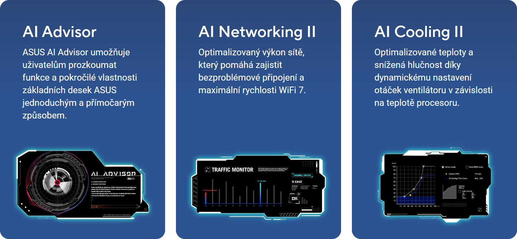 ASUS AI Solutions zahrnují AI Advisor jako vašeho technického experta s odbornými znalostmi o výkonu PC, AI Networking II pro optimalizaci šířky pásma v reálném čase a AI Cooling II pro automatickou regulaci teploty.
