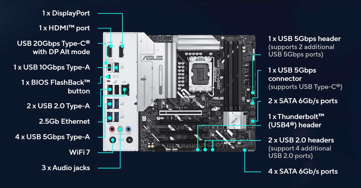 Základní deska PRIME Z890M-PLUS WIFI nabízí všestrannou škálu připojení, včetně podpory WiFi 7, nejnovější verze PCI Express a arzenálu portů USB včetně připojení typu C.