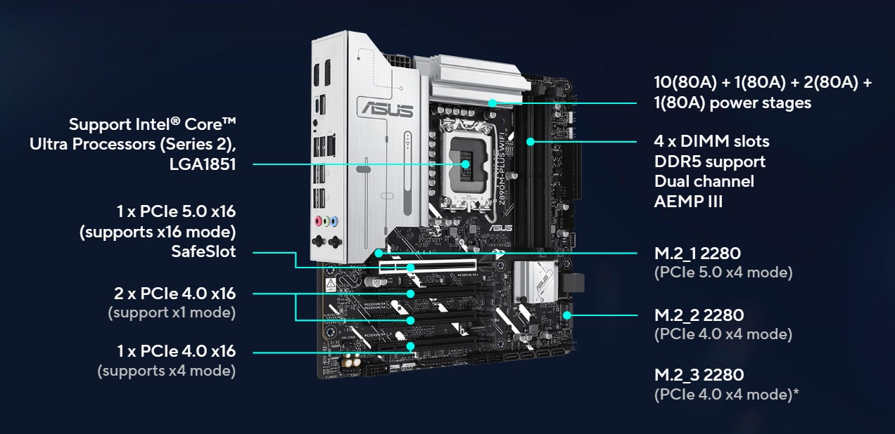 Stabilní napájení je klíčové pro maximální výkon procesorů Intel Core™ Ultra (řada 2). PRIME Z890M-PLUS WIFI je navržen tak, aby vyhovoval potřebám procesorů s vysokým počtem jader. Je vybaven 10(80A) + 1(80A) + 2(80A) + 1(80A) napájecími stupni, které integrují high-side a low-side tranzistory MOSFET a ovladače v pouzdrech dimenzovaných až na 80 ampér každý. Tato konfigurace zajišťuje optimální napájení, účinnost, stabilitu a výkon pro současné i budoucí procesory Intel.
