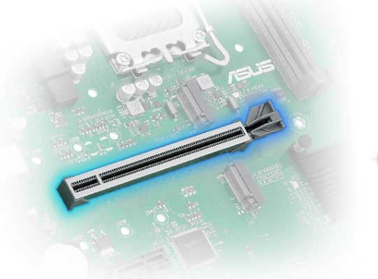Standard PCIe 5.0 nabízí oproti PCIe 4.0 dvojnásobnou rychlost přenosu dat, a proto je dostatečně robustní, aby zvládl nové úlohy s velkým objemem dat. PCIe 5.0 přináší i další výhody, jako jsou elektrické změny pro zlepšení integrity signálu, zpětně kompatibilní CEM konektory pro přídavné karty a zpětná kompatibilita s předchozími verzemi PCI Express. SafeSlot je vyztužený kovový plášť přidaný do slotu PCIe, který zajišťuje pevnou instalaci karty.