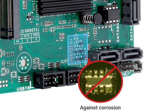 Inovativní povrchová úprava odolná proti vlhkosti chrání základní desku ve vlhkém prostředí, jako jsou továrny, knihovny, datová centra a internetové kavárny. Rovněž minimalizuje vnitřní korozi tím, že zabraňuje ulpívání a migraci vlhkosti, čímž prodlužuje životnost základní desky.