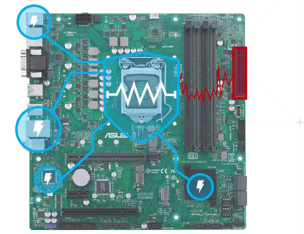 ASUS ESD Guards zabraňuje poškození elektrostatickým výbojem až do +/- 10 kV pro vzduchový výboj, a +/-15 kV pro kontaktní výboj – to vše v provedení s aktivním ochranným obvodem, který prodlužuje životnost komponent.